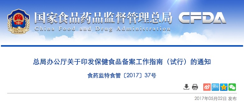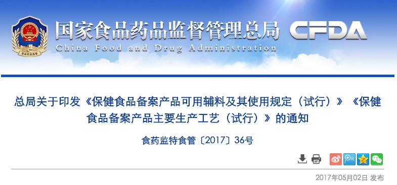 2017年5月2日,CFDA正式印發(fā)《保健食品備案工作指南(試行)》的通知,同時發(fā)布《保健食品備案信息系統(tǒng)上線運行的通告》及《保健食品備案產(chǎn)品可用輔料及其使用規(guī)定(試行)》《保健食品備案產(chǎn)品主要生產(chǎn)工藝(試行)》從而全面啟動保健食品備案。