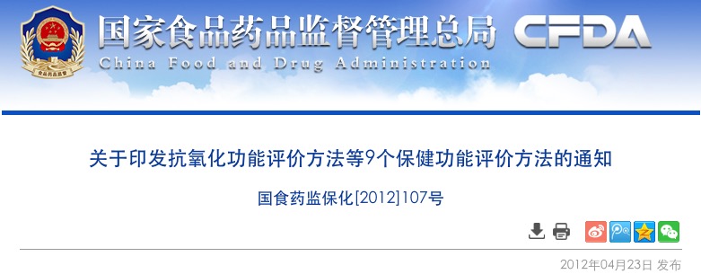 為貫徹落實(shí)《食品安全法》及其實(shí)施條例對保健食品實(shí)行嚴(yán)格監(jiān)管的要求,加強(qiáng)保健食品準(zhǔn)入管理,切實(shí)提高準(zhǔn)入門檻,國家食品藥品監(jiān)督管理局組織修訂了抗氧化等9個功能的評價方法,已經(jīng)保健食品安全專家委員會審議通過,現(xiàn)予印發(fā)。自2012年5月1日起,對受理的申報注冊保健食品的相關(guān)產(chǎn)品檢驗(yàn)申請,保健食品注冊檢驗(yàn)機(jī)構(gòu)應(yīng)當(dāng)按照新發(fā)布的9個功能評價方法開展產(chǎn)品功能評價試驗(yàn)等各項(xiàng)工作。